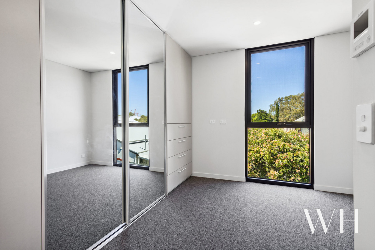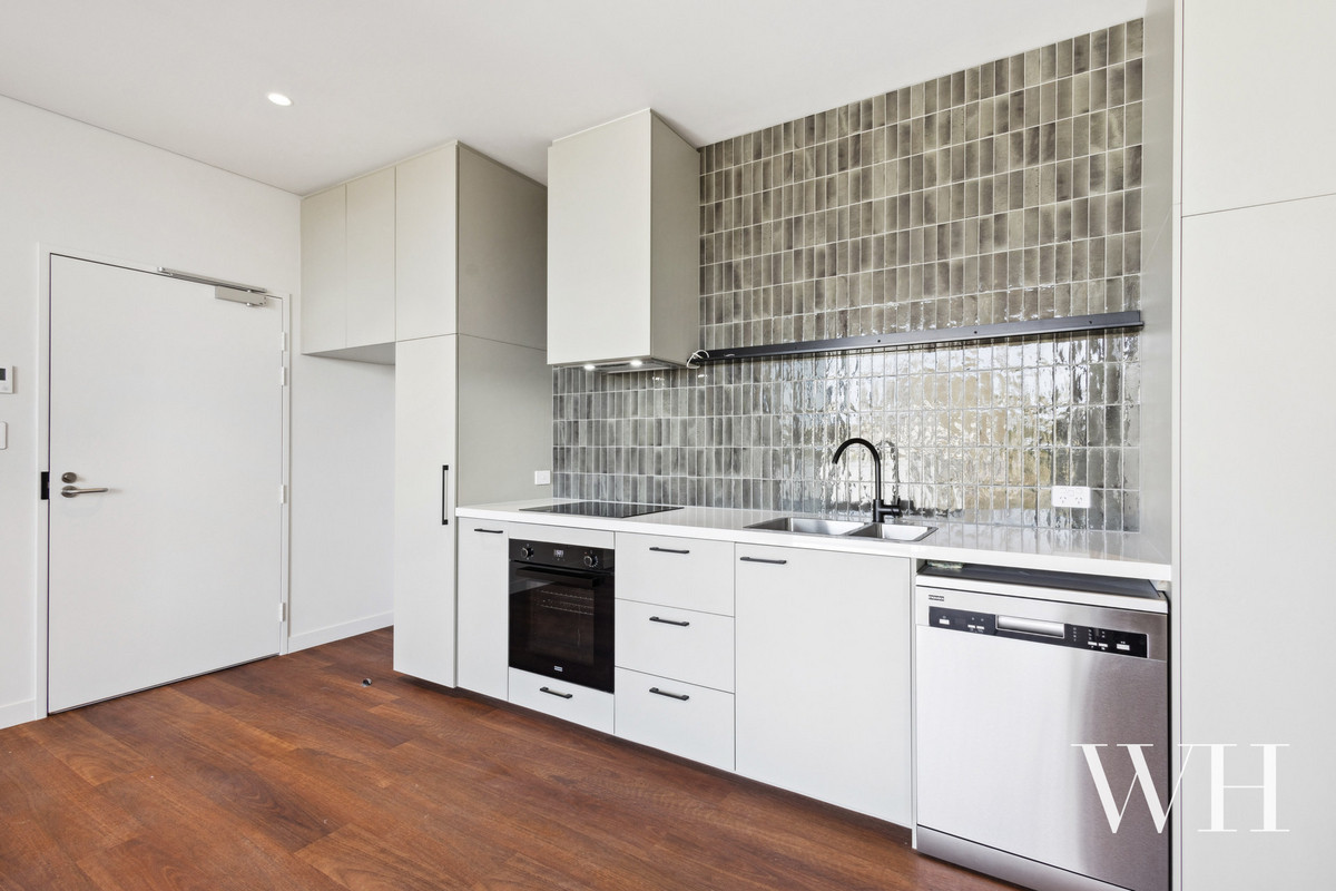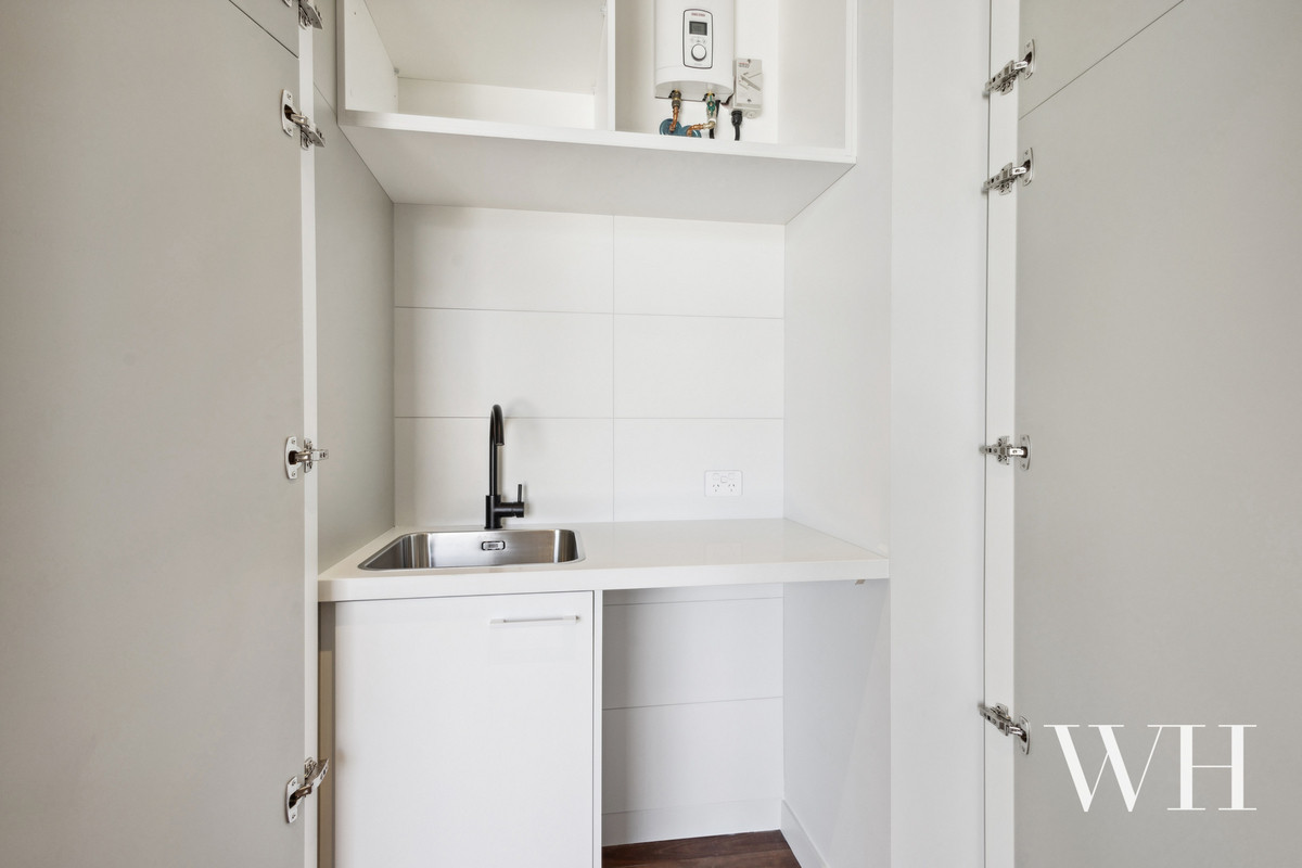 This first-level apartment features open-plan living and flows out seamlessly to a generous balcony. The kitchen is a standout, with sleek modern finishes contrasting with handmade tiles that echo the surrounding greenery visible from interiors and balcony. The cleverly integrated European laundry provides convenience and storage.