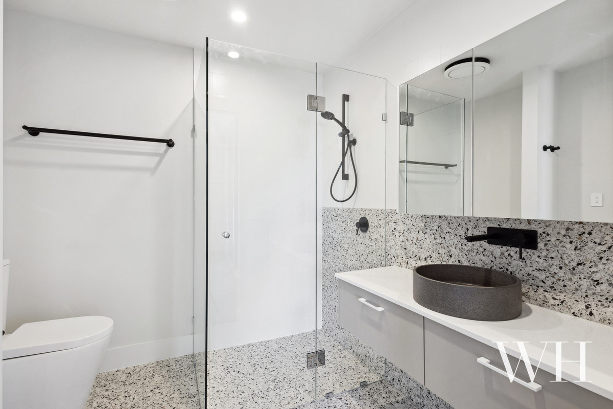 The generously proportioned bedroom is designed with custom cabinetry providing ample storage, ensuring you have everything you need to live comfortably. The beautifully crafted bathroom features terrazzo, ensuited direct from the bedroom and accessible from living spaces for convenience.
