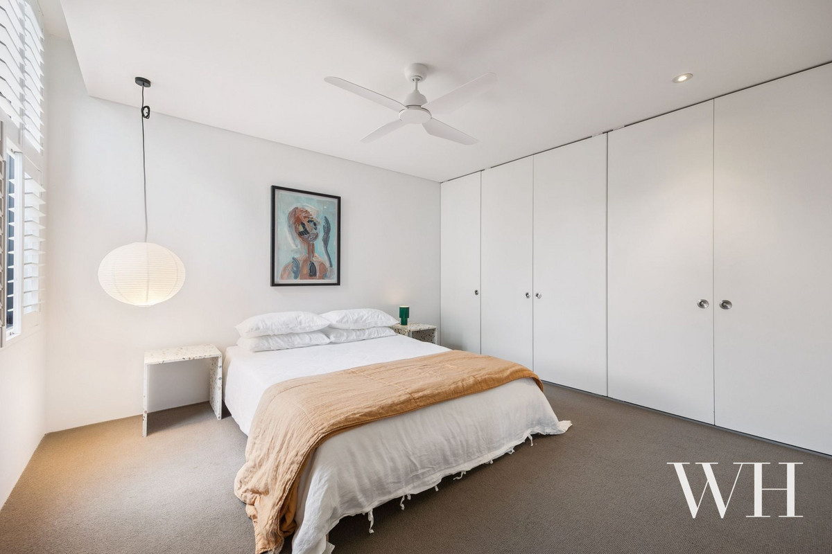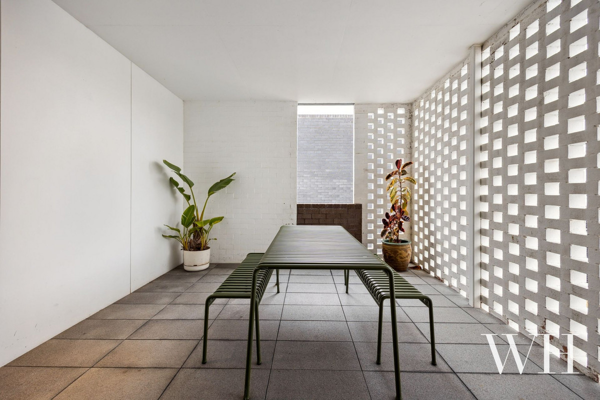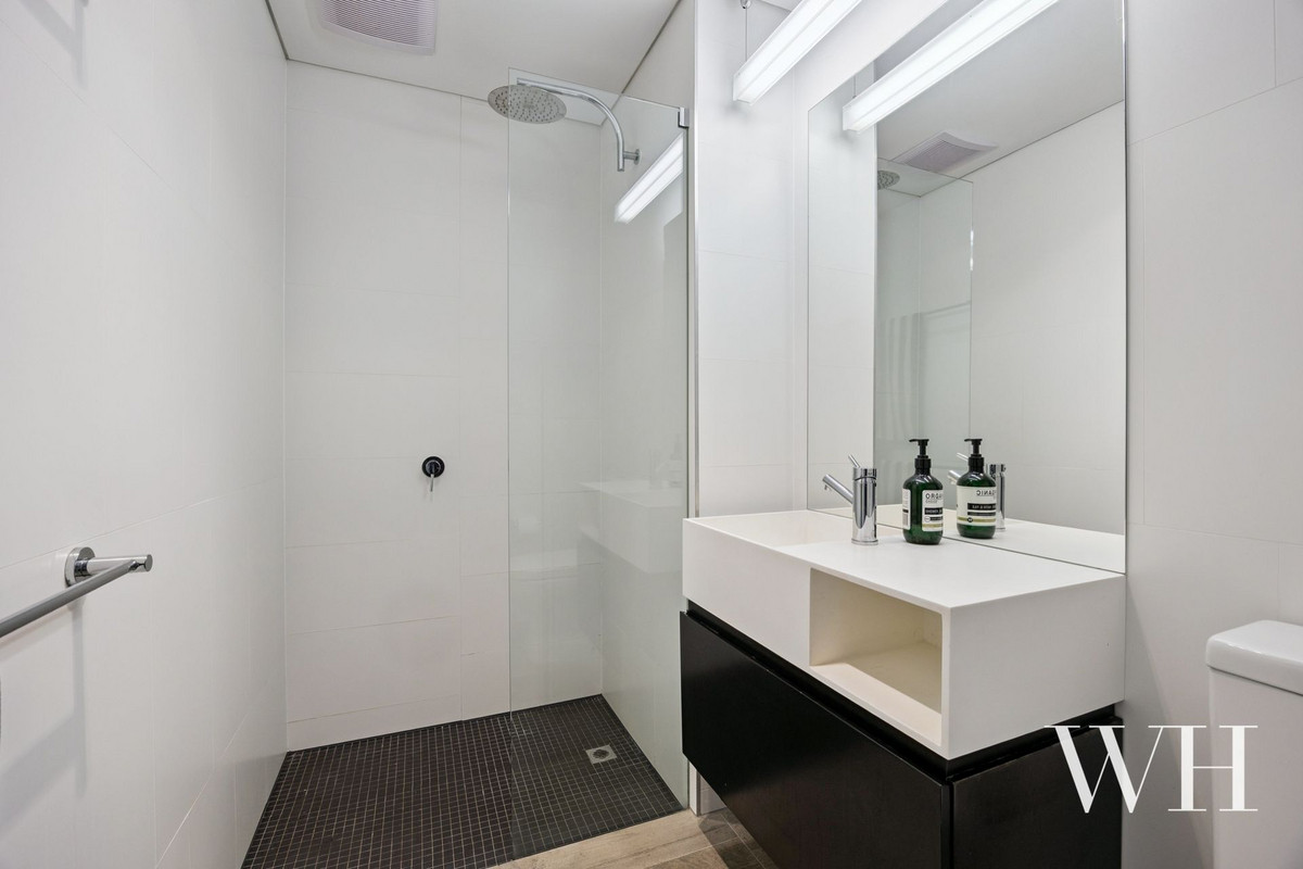 Completing this industrial-inspired apartment, the bathroom features a glass framed rainshower, vanity, and toilet, before the main bedroom unfolds to a wall of built-in robes and lovely outlook to the courtyards below. There’s also a secure remote lock-up garage for one car, accessed via Kybra Lane, with a private storeroom for personal belongings.