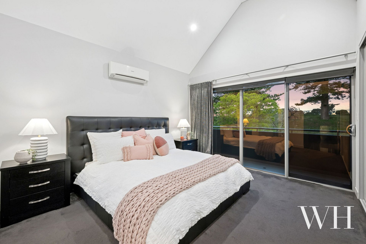 Upstairs, angled glass frames the magnificent outlook. Marine-grade stainless steel and glossy timber floors nod to a maritime aesthetic, and the flow between the sheltered balcony (with a built-in BBQ and mini fridge), living, dining and kitchen is effortless. Stone benchtops, a waterfall-edge breakfast bar, and integrated Miele appliances – including a dishwasher, Miele oven, coffee machine & steamer, and gas stovetop – define the luxe kitchen. Beyond is a powder room and stunning master suite with a private balcony looking east to Stevens Reserve, abundant built-in storage, and an opulent ensuite for two: huge bath, double vanity, and twin rainshowers, with access to the powder room.
