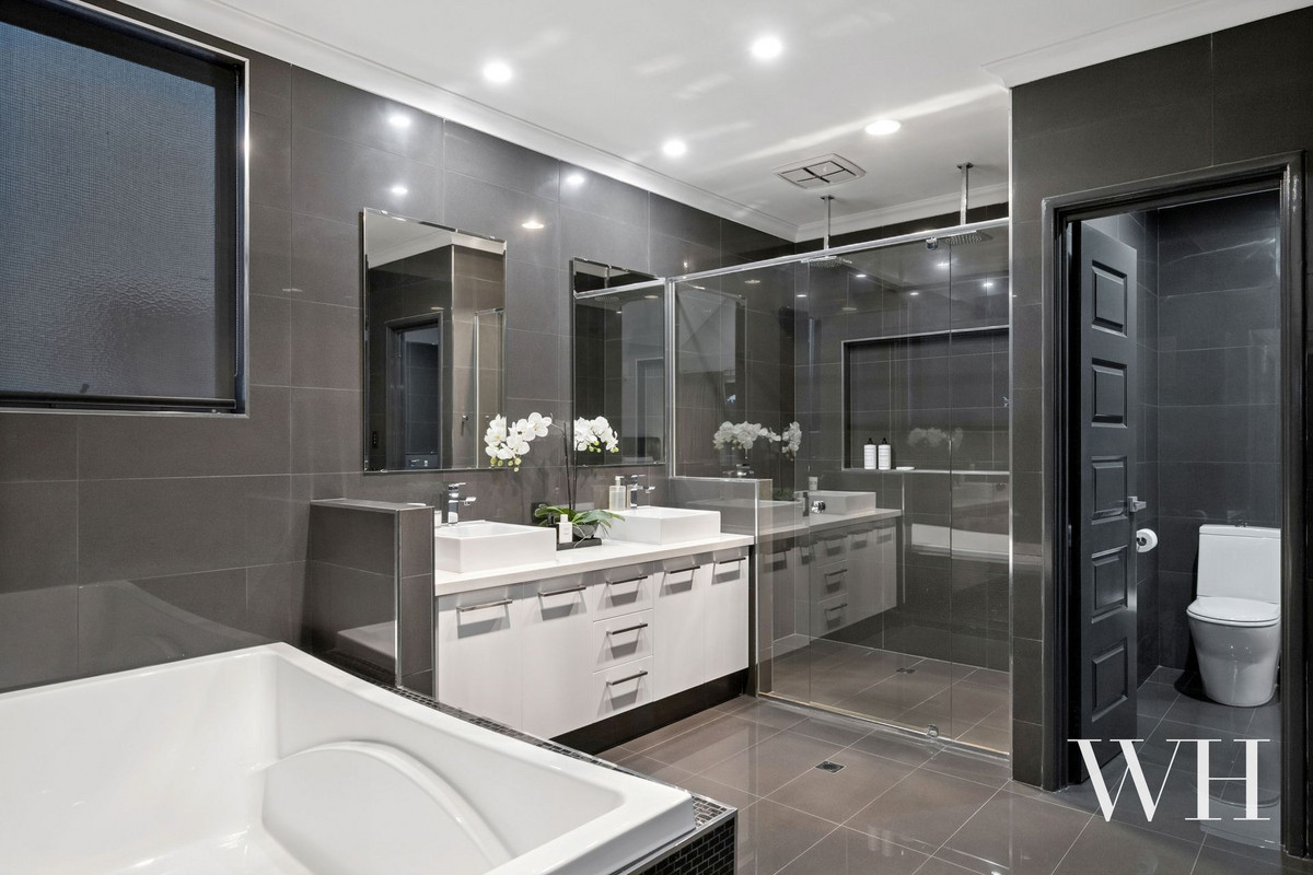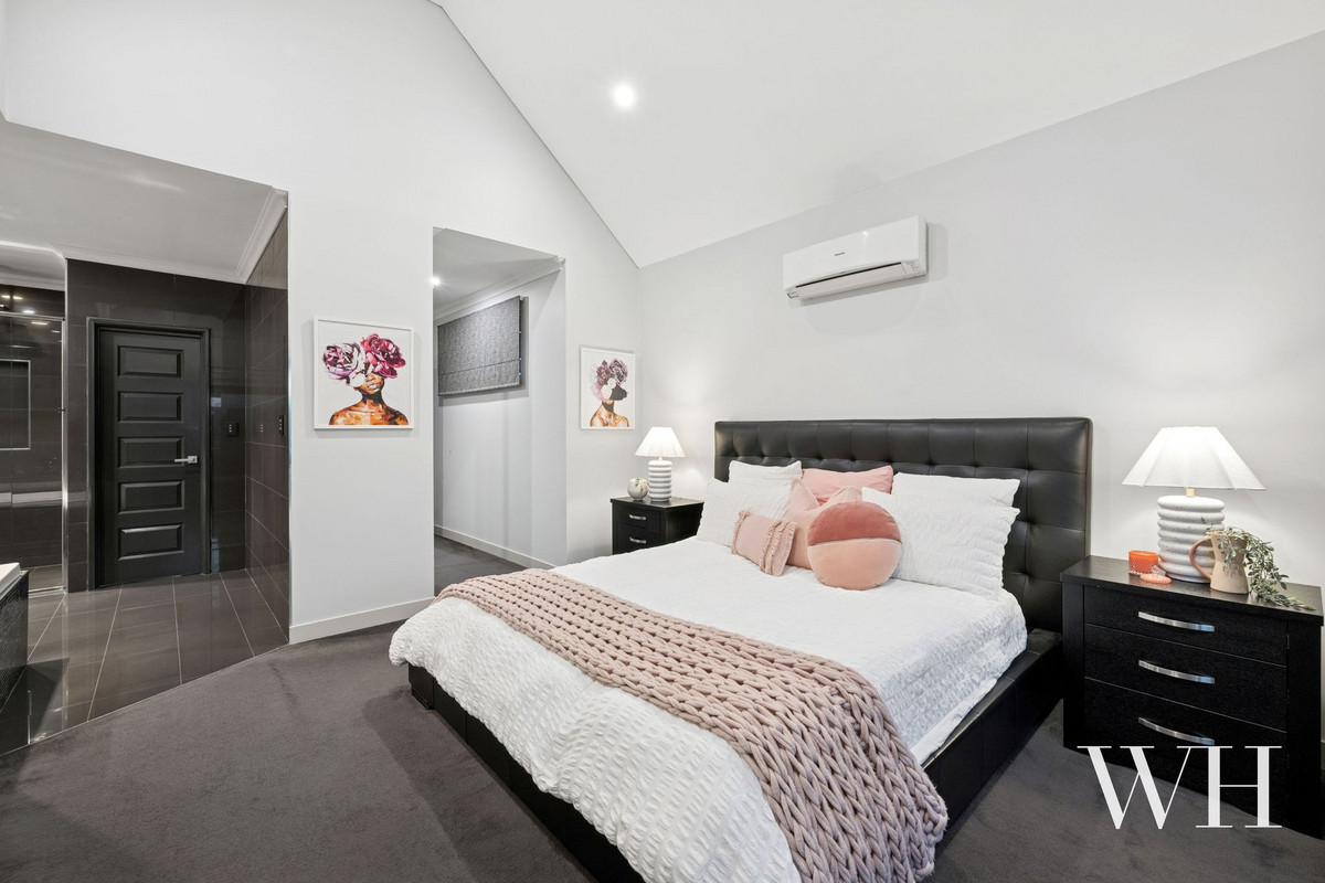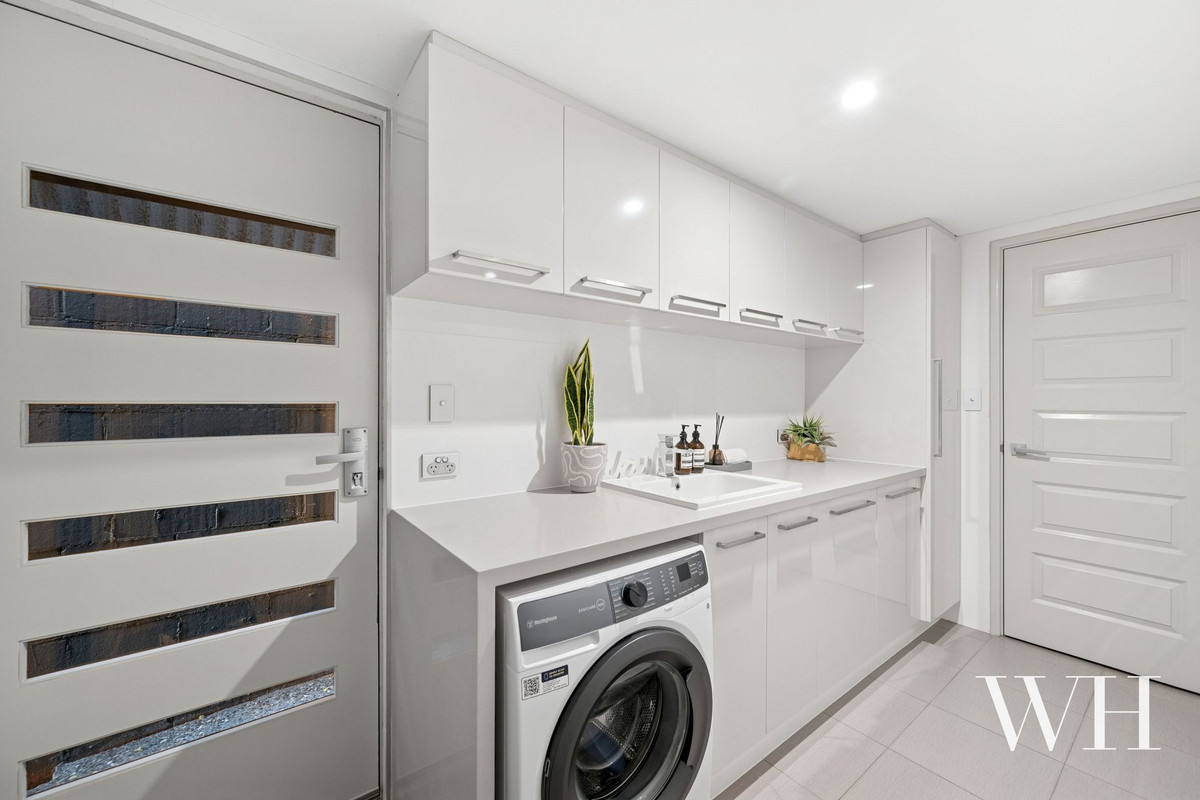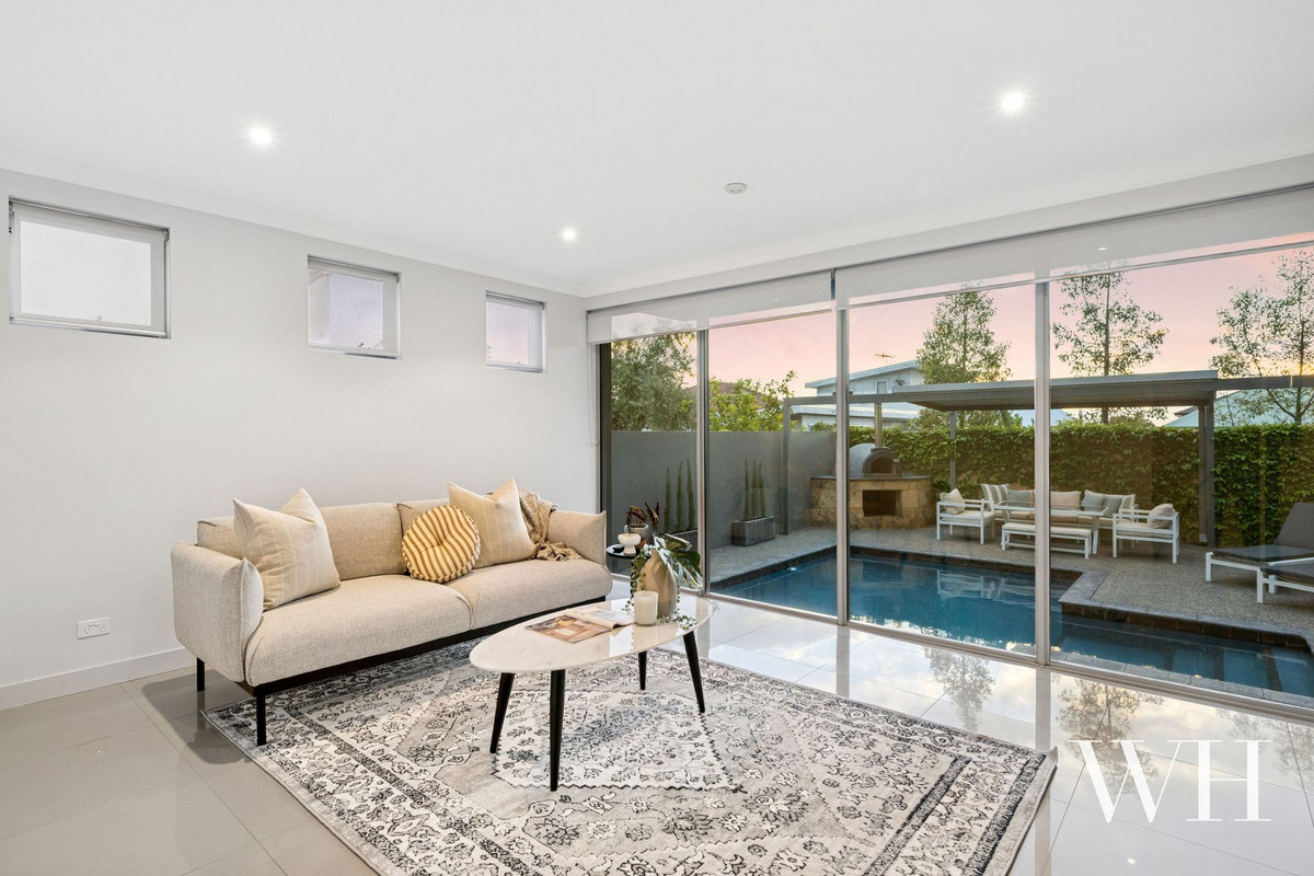 Introduced by landscaped surrounds, inside is the quiet luxury of brilliant craftsmanship. Glossy oversized tiles lead to two plush carpeted bedrooms with built-in robes, connected by a refined semi-ensuite bathroom for two. There’s a shopper’s entry from the double lock-up garage, alongside a laundry, guest powder room, and multi-purpose room – gym, living, playroom, teenagers’ retreat, or additional bedroom – overlooking the sparkling pool through walls of glass. Outside, lush garden walls lead to a poolside pavilion, complete with a pizza oven and outdoor shower.