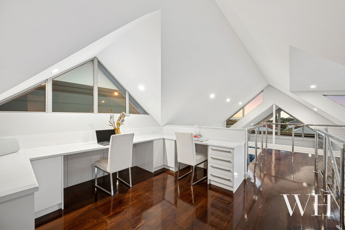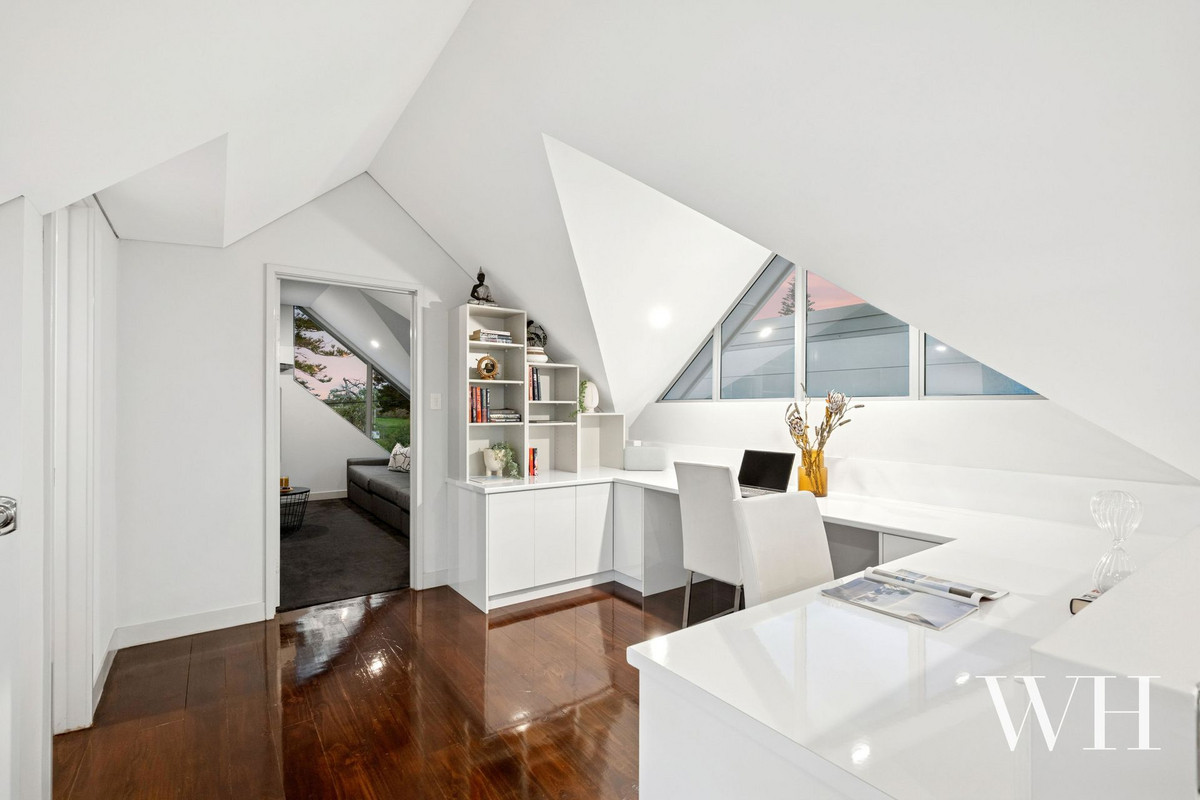Above it all, the third level is made for quiet retreat. There’s a wraparound built-in desk – perfect for those who work from home – another powder room, and a carpeted lounge with lovely treetop views that can be configured however you like.